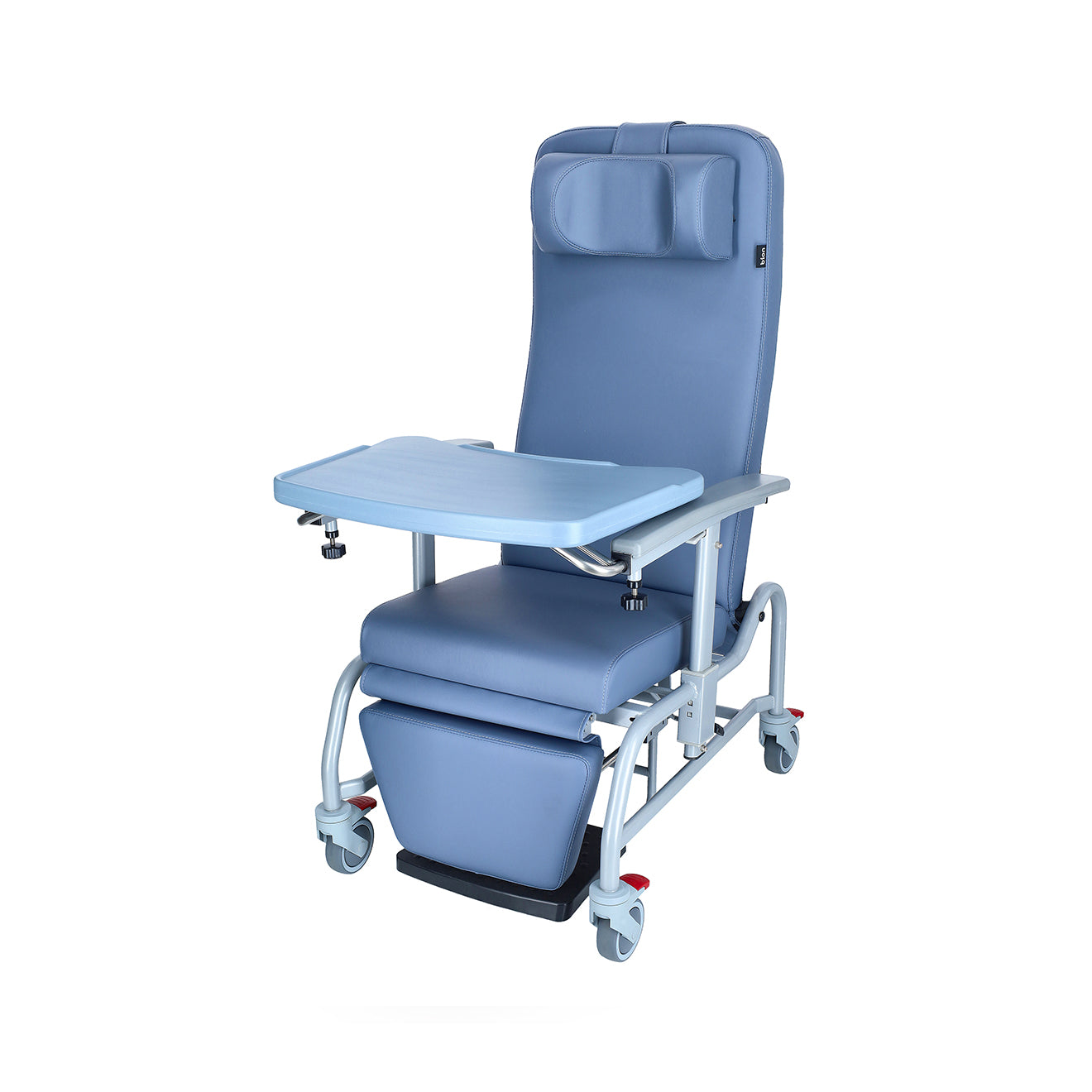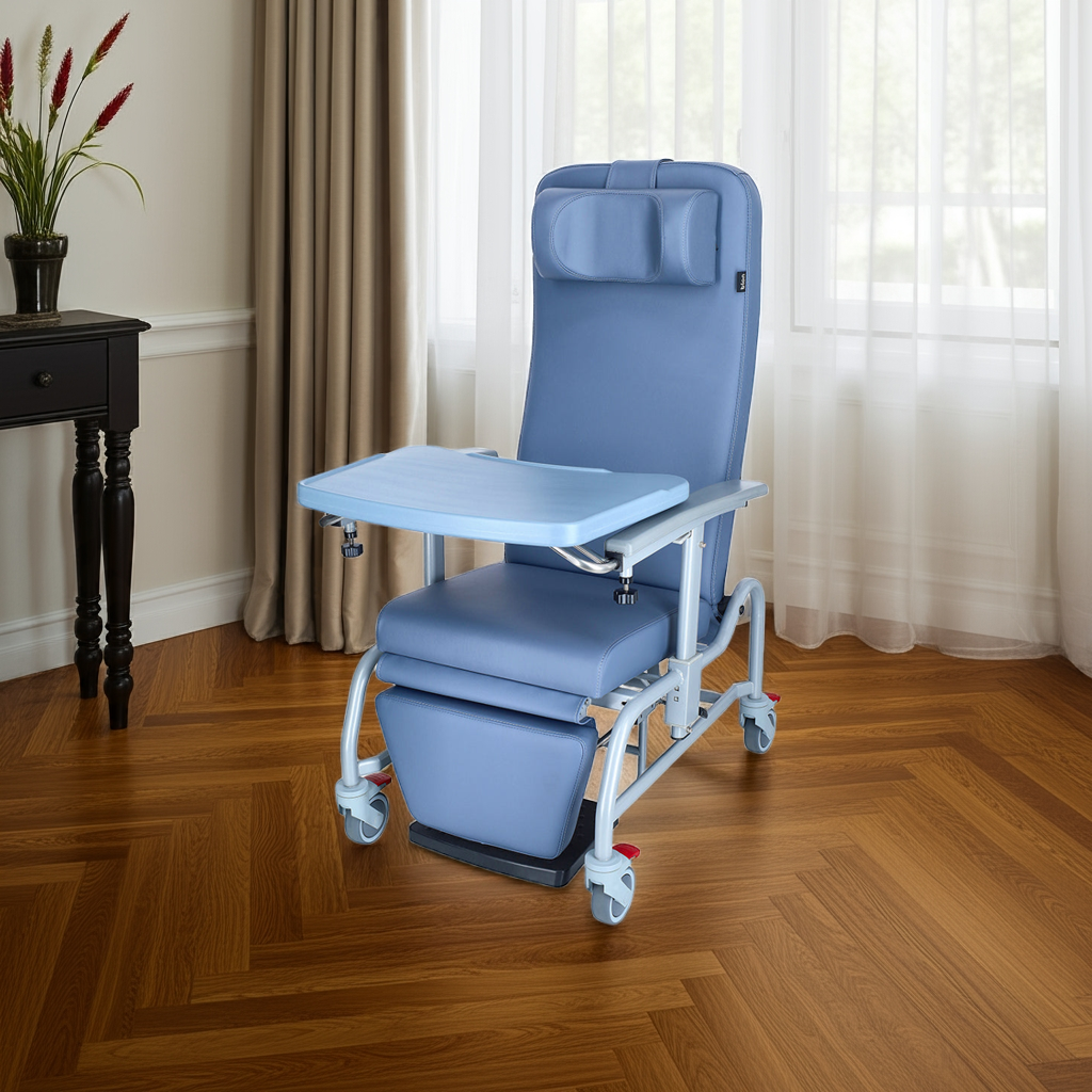 The geriatric chair reclines beyond 150°, allowing users to nap comfortably whenever they wish. Thoughtfully designed for convenience, it includes a stowable meal tray, ensuring a clutter-free space when not in use.