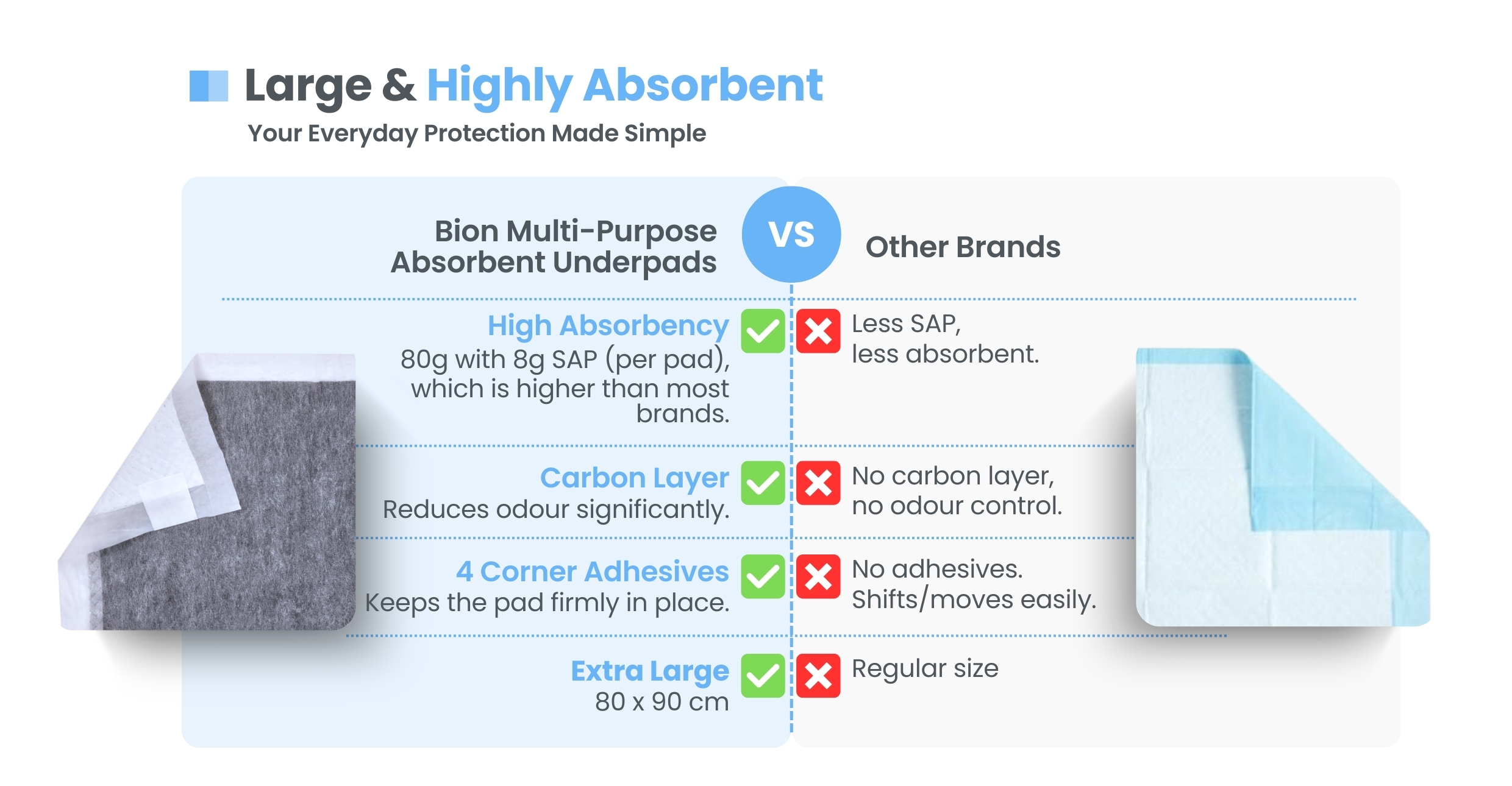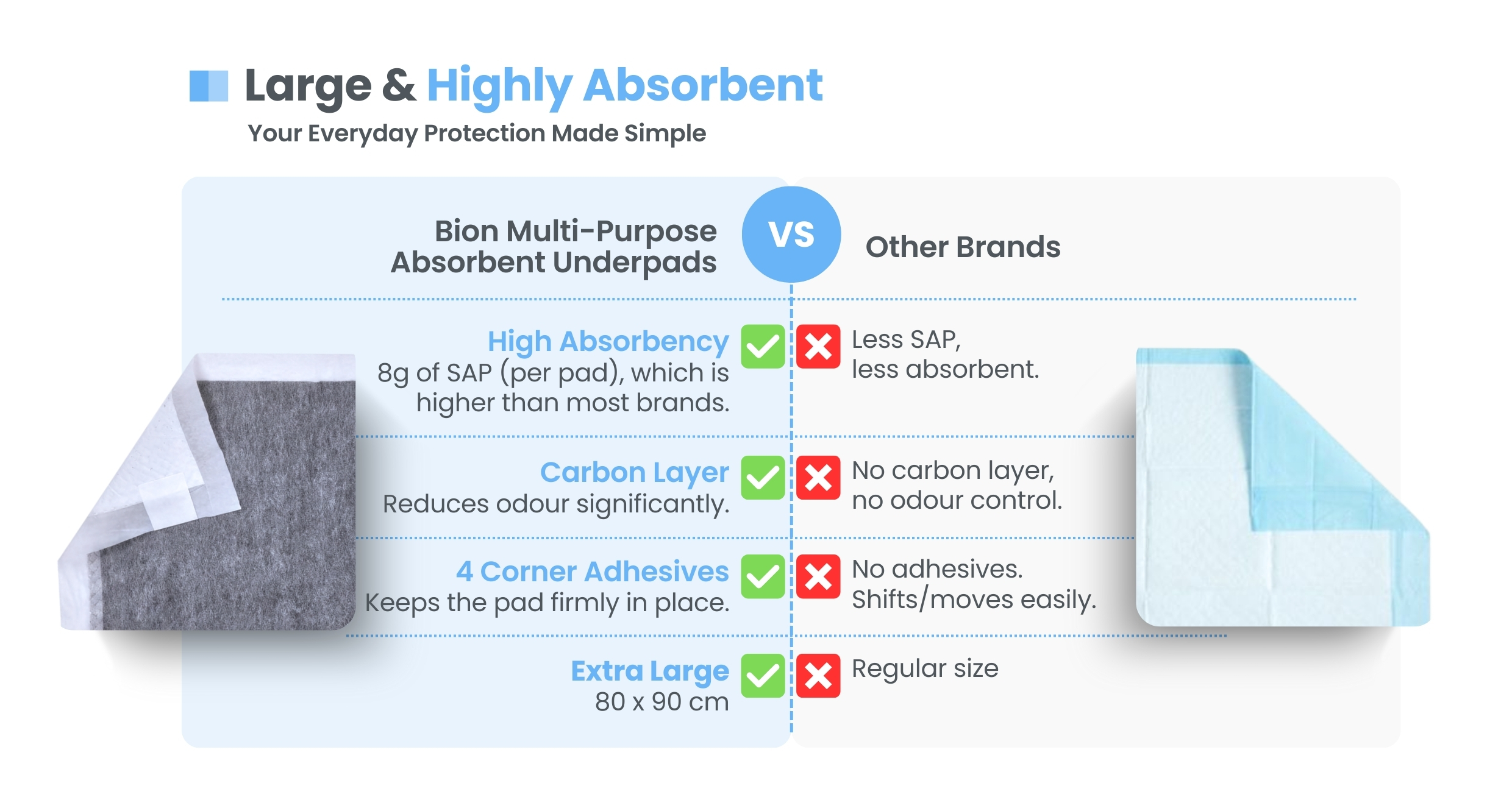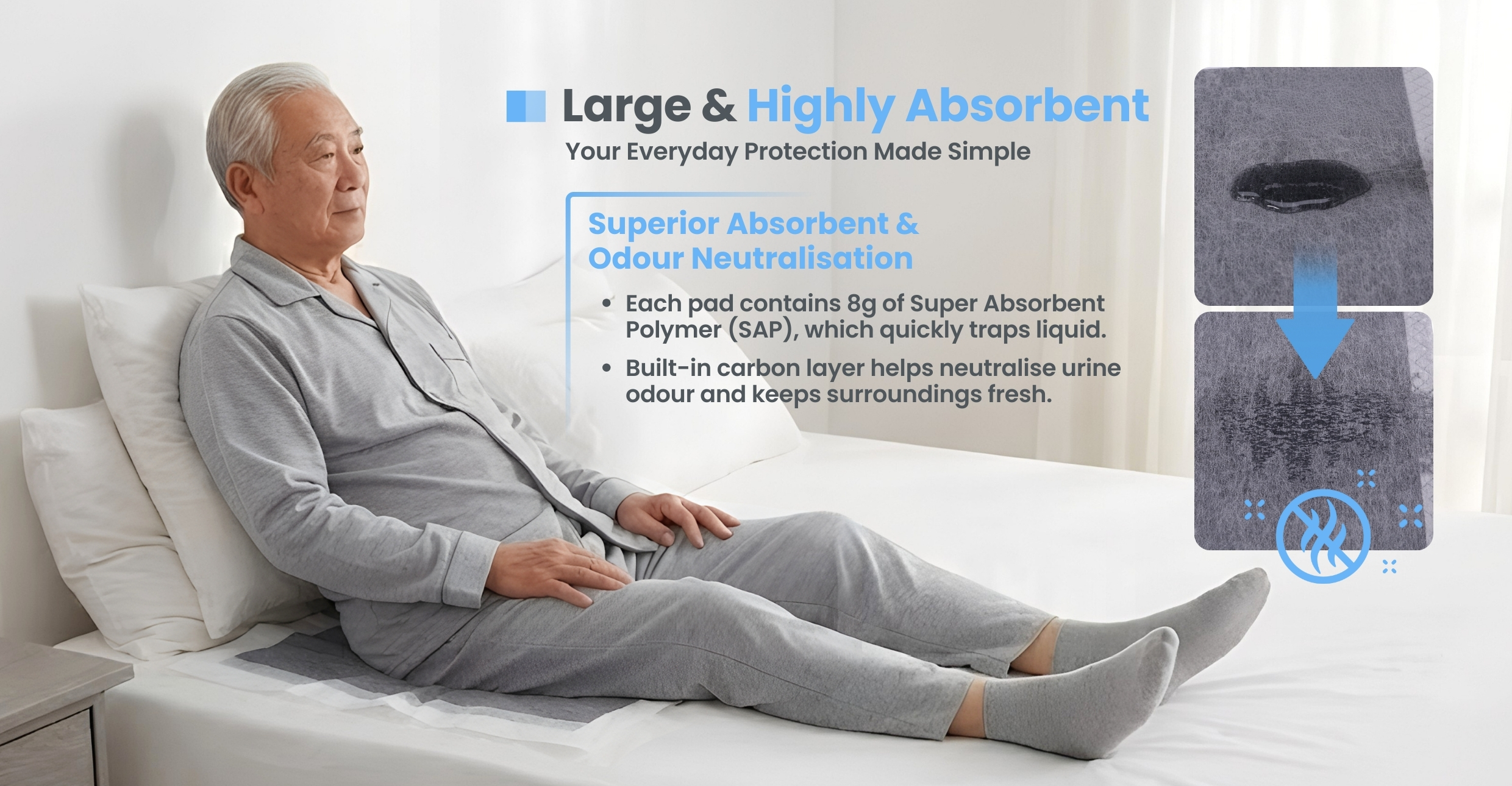 Each pad contains 8g of Super Absorbent Polymer (SAP), which quickly traps liquid. Built-in carbon layer helps neutralise urine odour and keeps surroundings fresh.